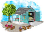 Royalty-free clipart of an almond colored car parked in a garage with an attached patio. You can see jumper cables and a gas can near the car. There are tools out on the patio and potted plants in the yard. Texturing of real items are included, such as the leaves on the tree.